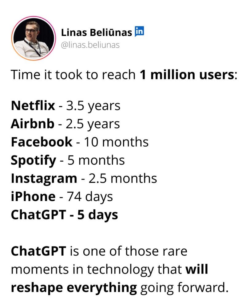 As we can see in the LinkedIn post from Linas above, ChatGPT achieved one million users in one week. What took ChatGPT only seven days, took the other tech giants months, even years to accomplish.