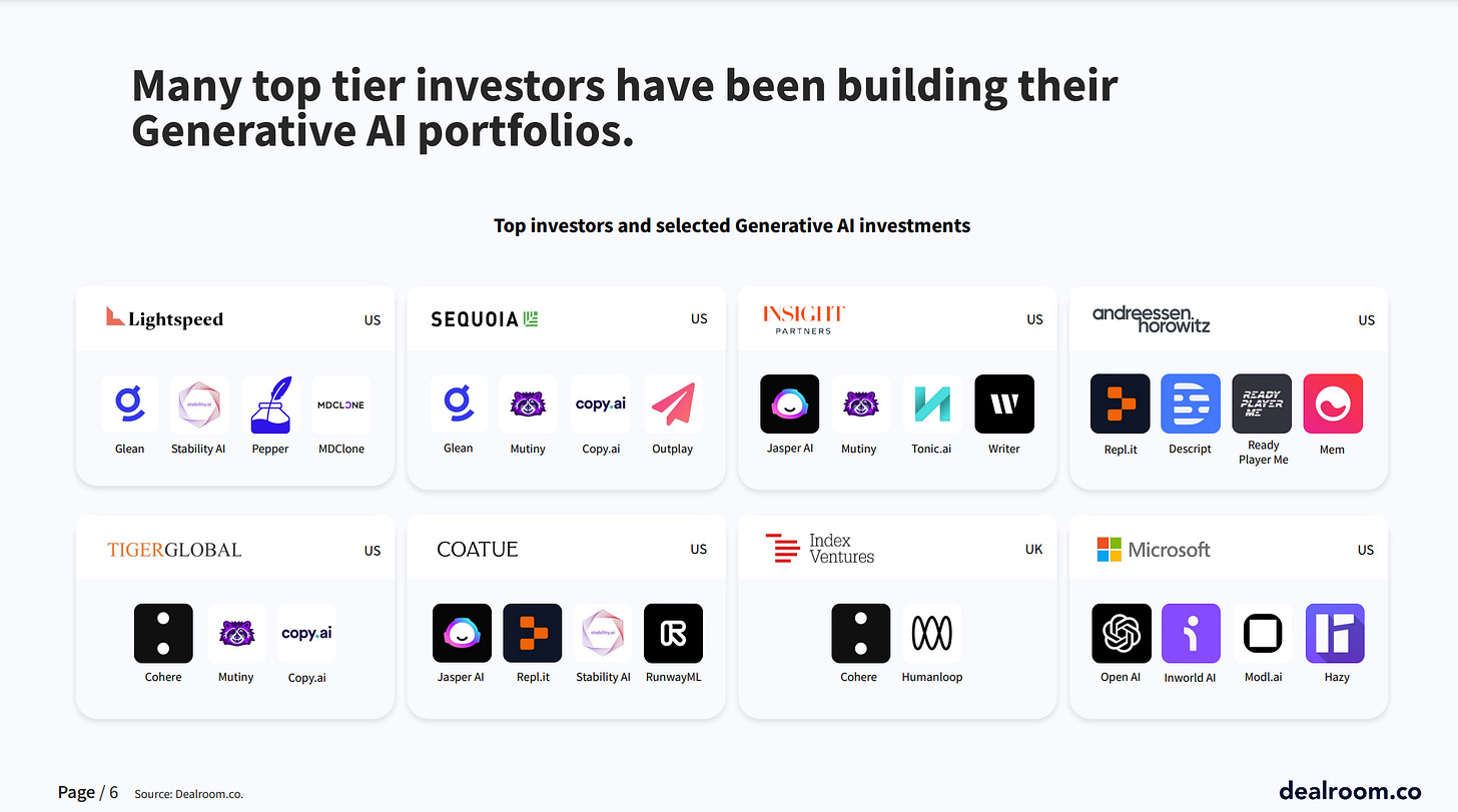 Dealroom’s infographic provides a glimpse into the Generative AI portfolios of some of the top VCs like Sequoia, Lightspeed, a16z, Microsoft, Tiger Global, etc.