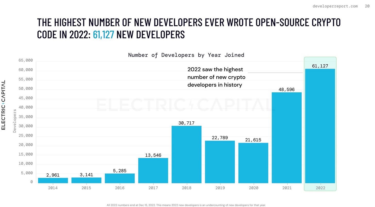 “Over 61,000 new developers wrote open-source crypto code in 2022,” according to Electric Capital.