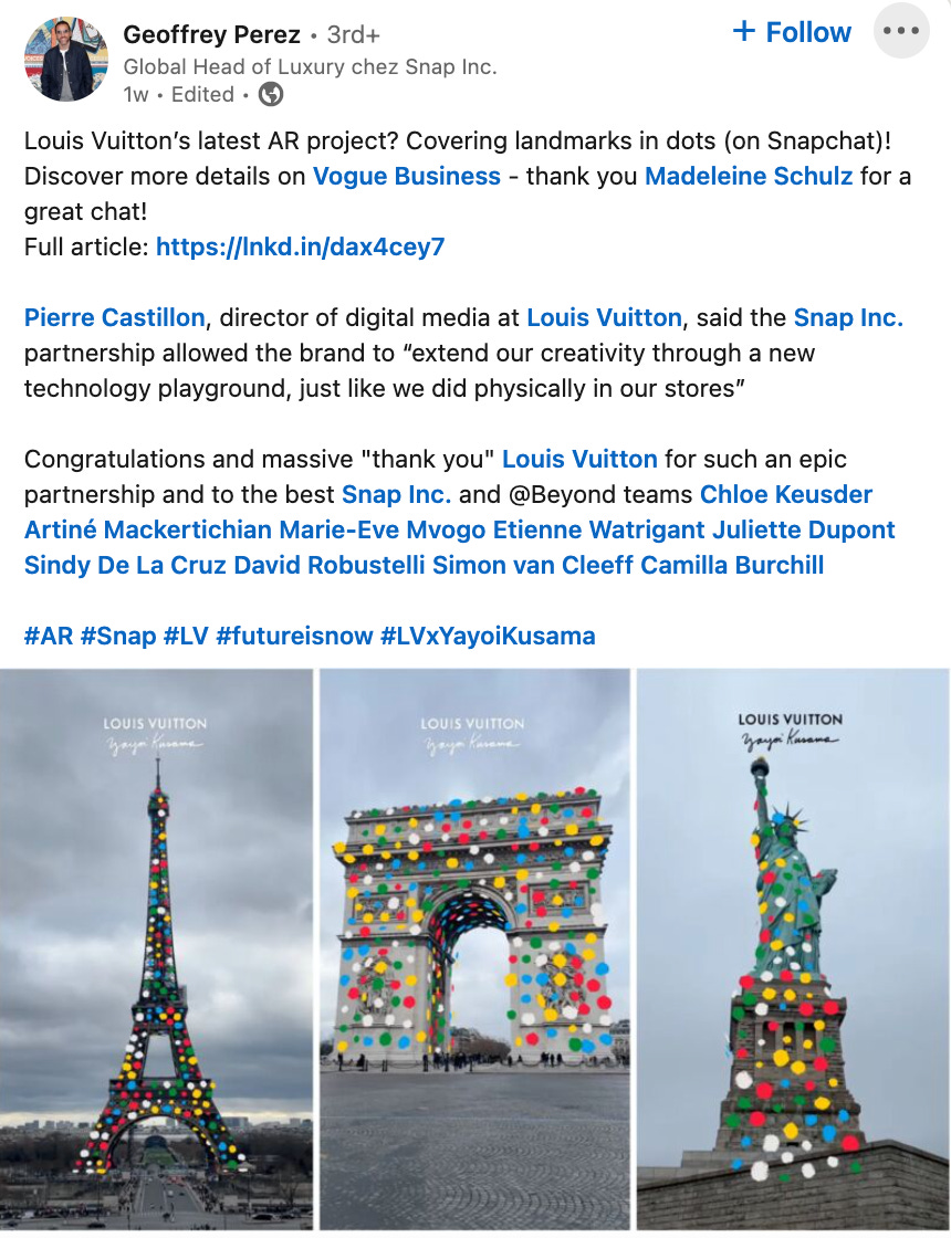 As pictured below from the Global Head of Luxury chez Snap Inc, Geoffrey Perez, shares on his LinkedIn about Louis Vuitton entering the metaverse with a filter that uses AI on Snapchat.